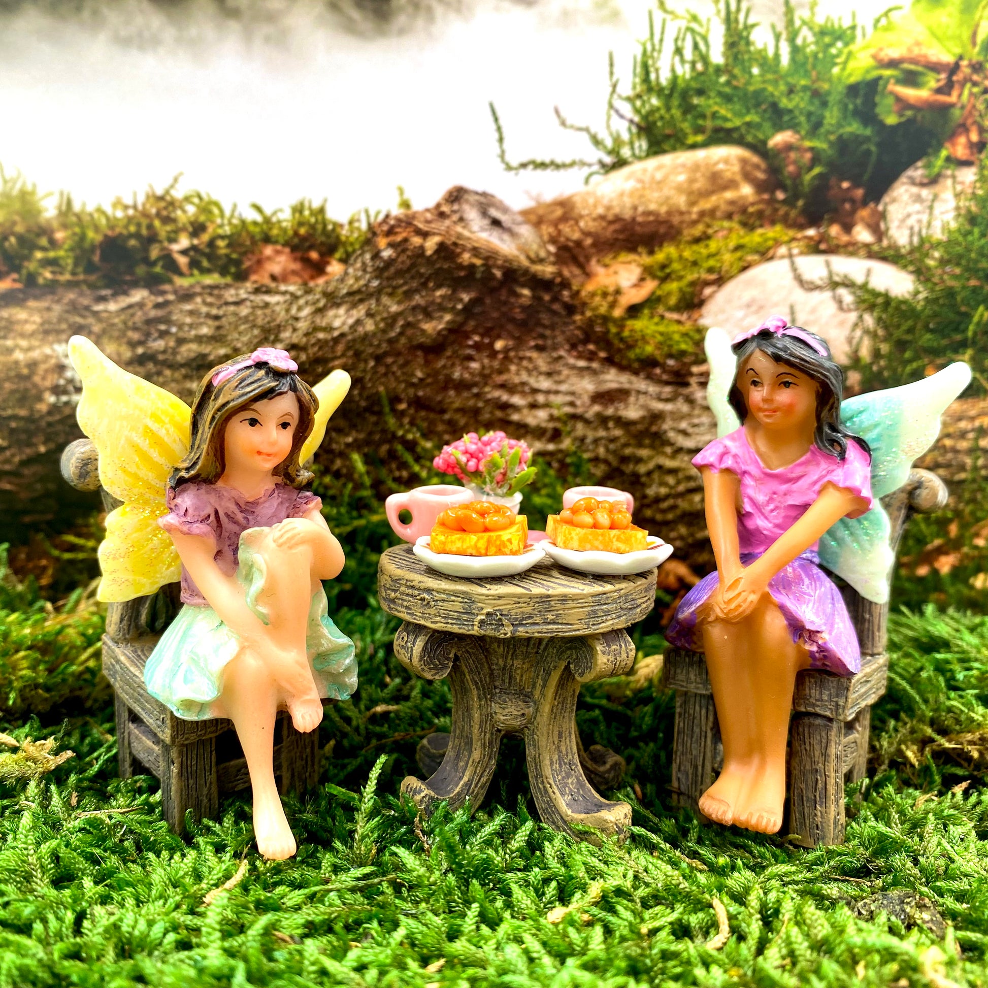 It includes two of our most popular sitting fairies, table and chairs and miniature food hand made from polymer clay. Both fairies are not fixed to the furniture allowing you to place freely in amongst your gardens. However the plates, toast, mugs and vase are all secured to the table.