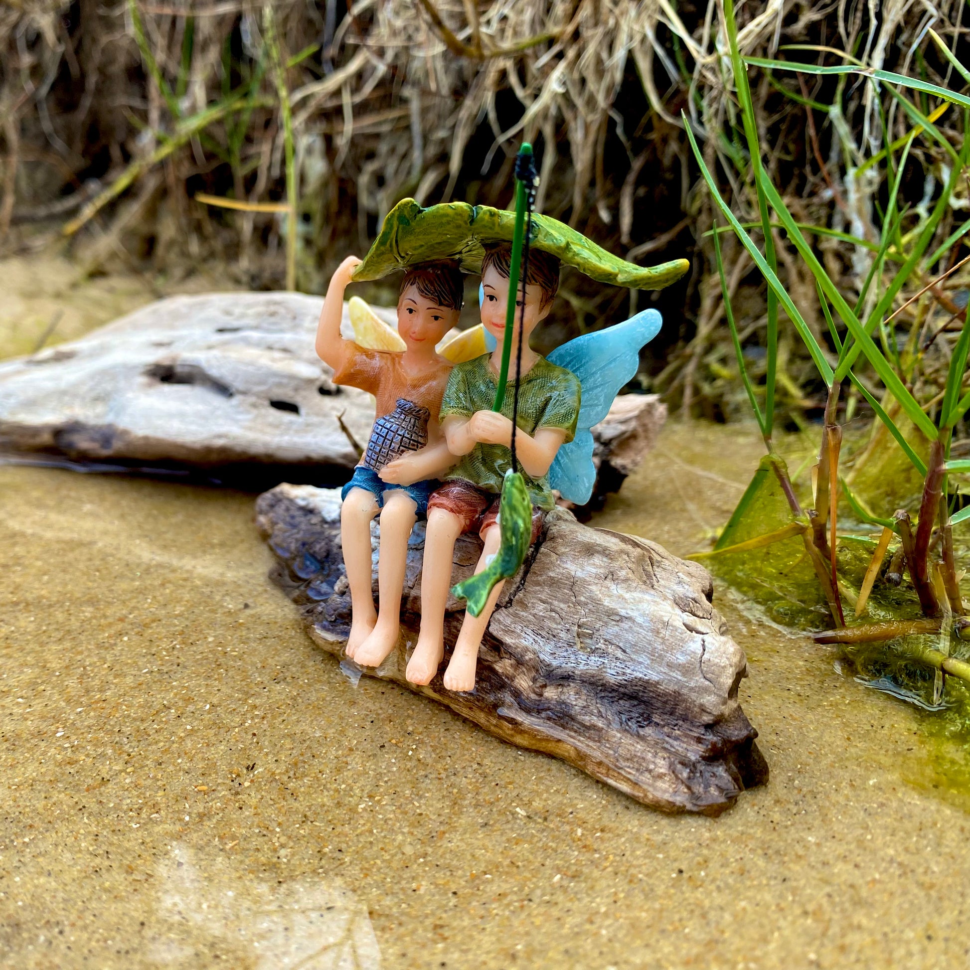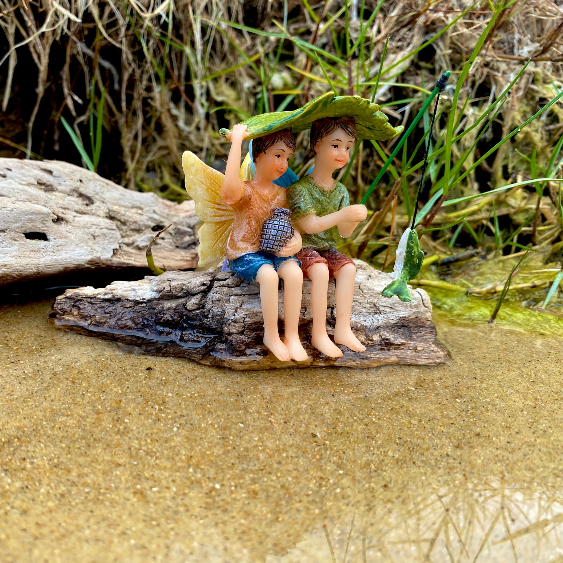 On the edge of the riverbanks you will find these playful boy fairies out on their finishing adventures. This adorable duo posed in a sitting position makes a perfect addition to any of your fairy garden ponds or rivers.