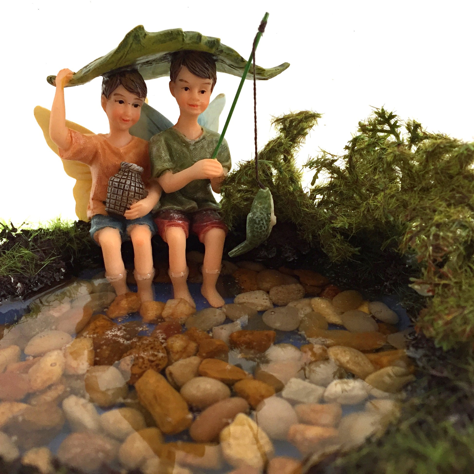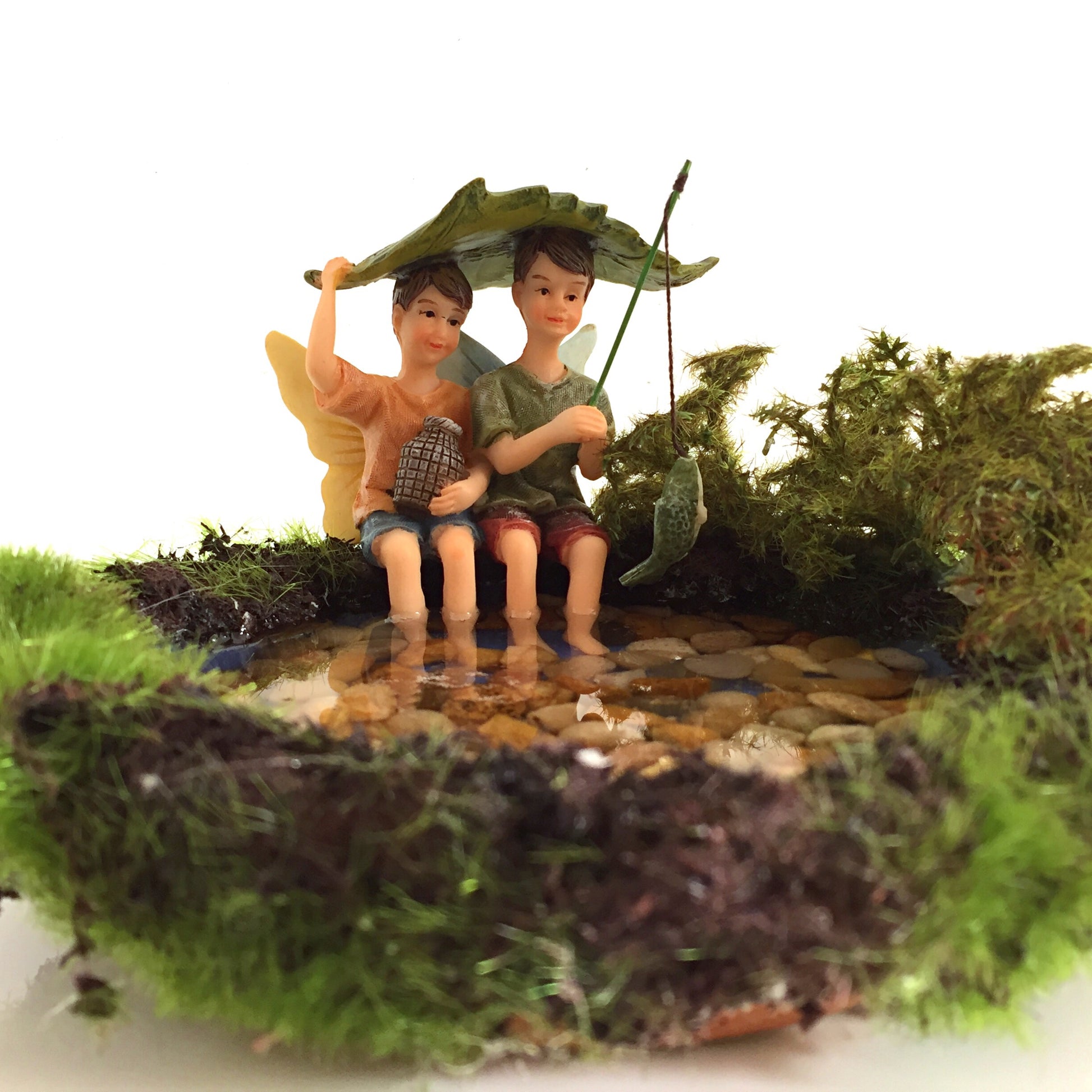 This pond is made from hand poured resin in a ceramic dish embellished with artificial mosses and plants. This product also incorporates our Fairy Garden Pebbles and Fishing boy fairy figures.